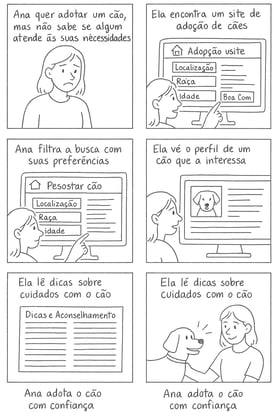 Complementamos nossa investigação primária com pesquisa secundária, analisando plataformas existentes e estudando casos de sucesso. Mapeamos jornadas de usuário que revelaram momentos de frustração, ansiedade e alegria ao longo do processo de adoção. Cada insight coletado foi traduzido em oportunidades concretas para intervenção de design.